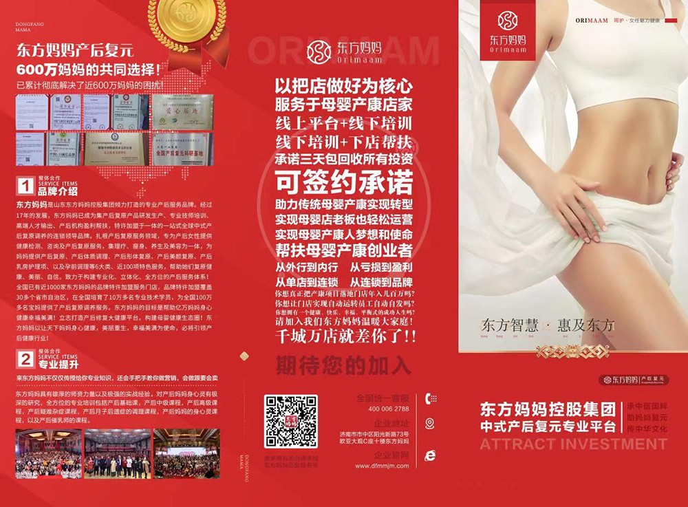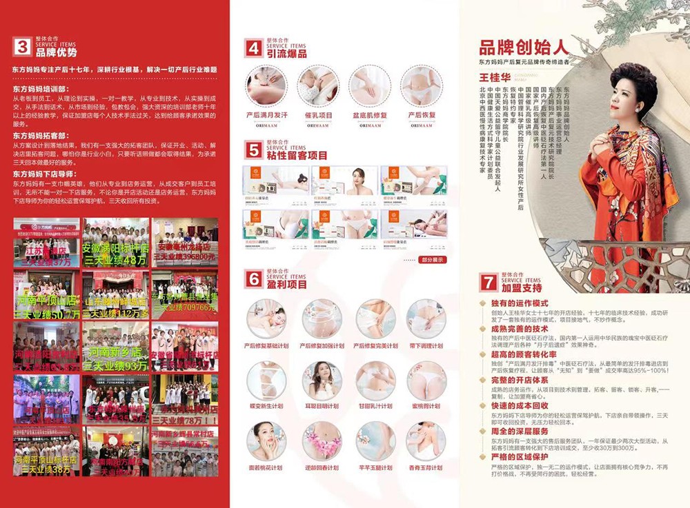 東方媽媽產(chǎn)后復(fù)元服務(wù)主要包含產(chǎn)后復(fù)元、產(chǎn)后體質(zhì)調(diào)理、產(chǎn)后形體恢復(fù)、產(chǎn)后美顏修復(fù)、產(chǎn)后乳房護(hù)理項(xiàng)、以及孕前調(diào)理等6大類、近100項(xiàng)特色服務(wù)。其中產(chǎn)后滿月發(fā)汗排毒,產(chǎn)后開奶催奶,產(chǎn)后溫腰固腎,產(chǎn)后子宮恢復(fù),產(chǎn)后惡露調(diào)理,產(chǎn)后骨盆修復(fù),產(chǎn)后補(bǔ)氣養(yǎng)血,產(chǎn)后十二經(jīng)絡(luò)疏通,產(chǎn)后中醫(yī)體質(zhì)調(diào)理等高端服務(wù)項(xiàng)目十年時(shí)間經(jīng)久不衰,而且東方媽媽因“中醫(yī)產(chǎn)后復(fù)元”特有技術(shù),不僅滿月后可以及時(shí)消除“月子病”,在生產(chǎn)百天、五六年后、甚至較大年齡客戶的遺留癥狀都可以真正解除病痛困擾。十五年磨一劍,十五年時(shí)間已累計(jì)徹底解決了近5000萬媽媽的困擾!隨著效果的顯著和認(rèn)可的人數(shù)越來越多,東方媽媽品牌也不脛而走,很多客戶紛紛前來要求加盟!而東方媽媽除了品牌輸出外,還把技術(shù)、銷售與管理等模塊系統(tǒng)化進(jìn)行通盤輸出,旨在讓加盟商整體導(dǎo)入后,能迅速順利運(yùn)營。截止目前在中國已有1000多家代理加盟商,遍及山東、北京、江蘇、安徽、山西、河南、河北、陜西、遼寧、吉林、黑龍江、廣西、四川、云南、甘肅、新疆、上海等地區(qū)。