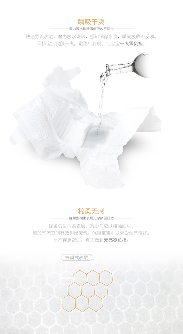 無紡布面料:精選極致柔軟穿孔無紡布面料,清爽透氣,質(zhì)地輕柔,有效吸收尿液和稀便,給寶寶zui大限度的柔軟體驗。