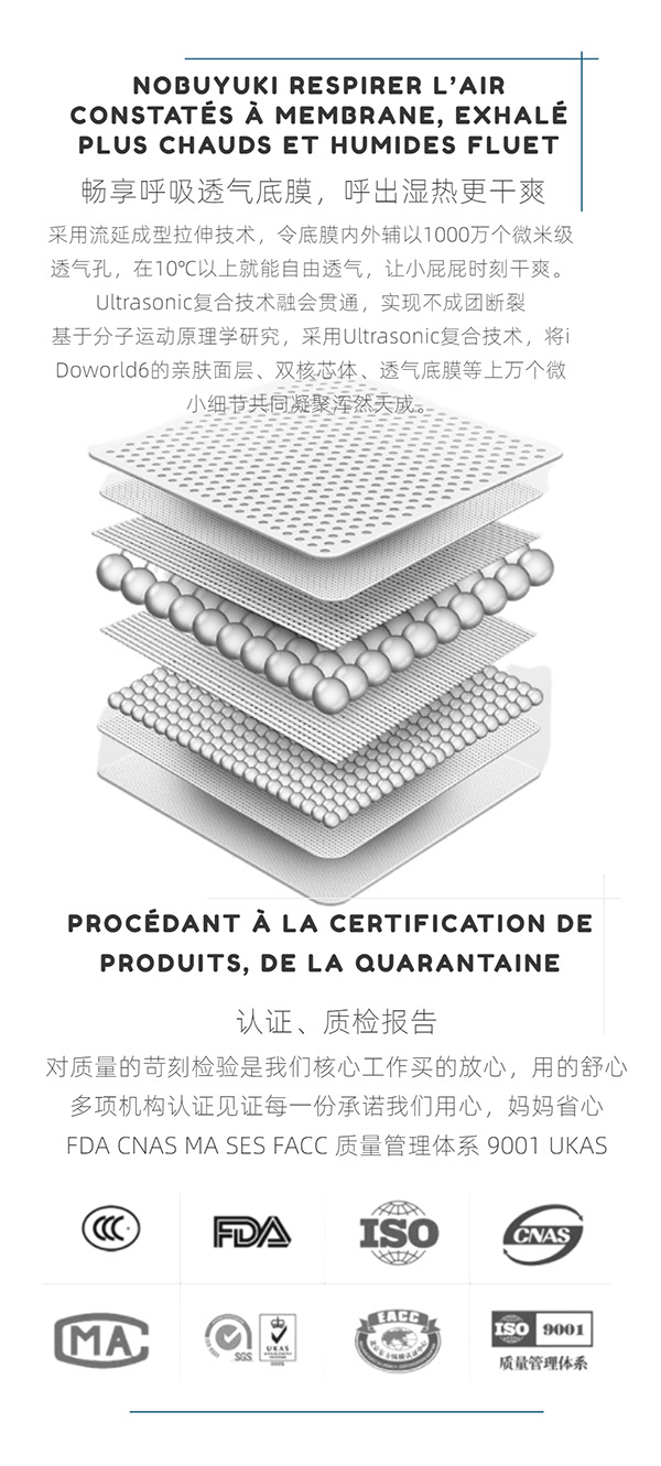 Ultrasonic復合技術融會貫通,實現不成團斷裂;诜肿舆\動原理學研究,采用Ultrasonic復合技術,將iDoworld6的親膚面層、雙核芯體、透氣底膜等上萬個微小細節共同凝聚渾然夭成。