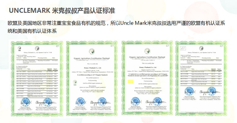 3.吃進肚子里的必須是安全的,米克叔叔產(chǎn)品已通過歐盟有機認證、美國有機認證、質(zhì)量管理體系認證、國際食品安全認證、優(yōu)良制造標(biāo)準(zhǔn)認證等相關(guān)國際認證。