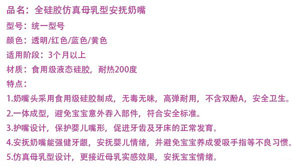 本品采用高級食品級矽膠(Liquid Silicone)制成,無毒、無味、耐高溫120℃可消毒、極好韌性、不易破、更耐用。本品對嬰兒牙床的發育和牙齦的保護有特殊效果。能促進嬰兒牙齒的正常發育及臉部肌肉運動。