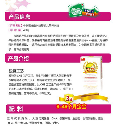 卡咪呢有機(jī)米粉系列是專為中國(guó)寶寶設(shè)計(jì)的營(yíng)養(yǎng)輔食,選用有機(jī)大米,科學(xué)搭配維生素AD等維生素,還特別添加牛磺酸、DHA、AA等有助智力發(fā)育的營(yíng)養(yǎng)成分,富含15種營(yíng)養(yǎng)素,F(xiàn)上?ㄟ淠啬笅胗闷酚邢薰久嫦蛉珖(guó)空白市場(chǎng)區(qū)域誠(chéng)招卡咪呢有機(jī)米粉代理商。