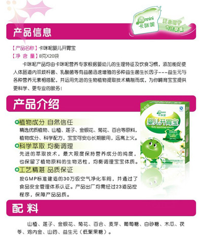 卡咪呢山楂麥芽嬰幼兒營養米粉是上海卡咪呢母嬰用品有限公司旗下產品,精選優質大米制作,搭配山楂和麥芽,由卡咪呢營養專家特別添加益生元與各種營養元素。山楂和麥芽都具有消食開胃的效果,讓寶寶越吃越開心。