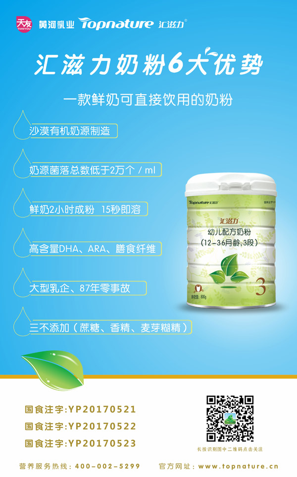 作為天友黃河乳業嬰幼兒配方奶粉的核心推廣品牌。匯滋力產品生產全部采用集團旗下天寧有機牧場的優質鮮奶制造,天寧有機牧場為農墾乳業聯盟中的標桿牧場。