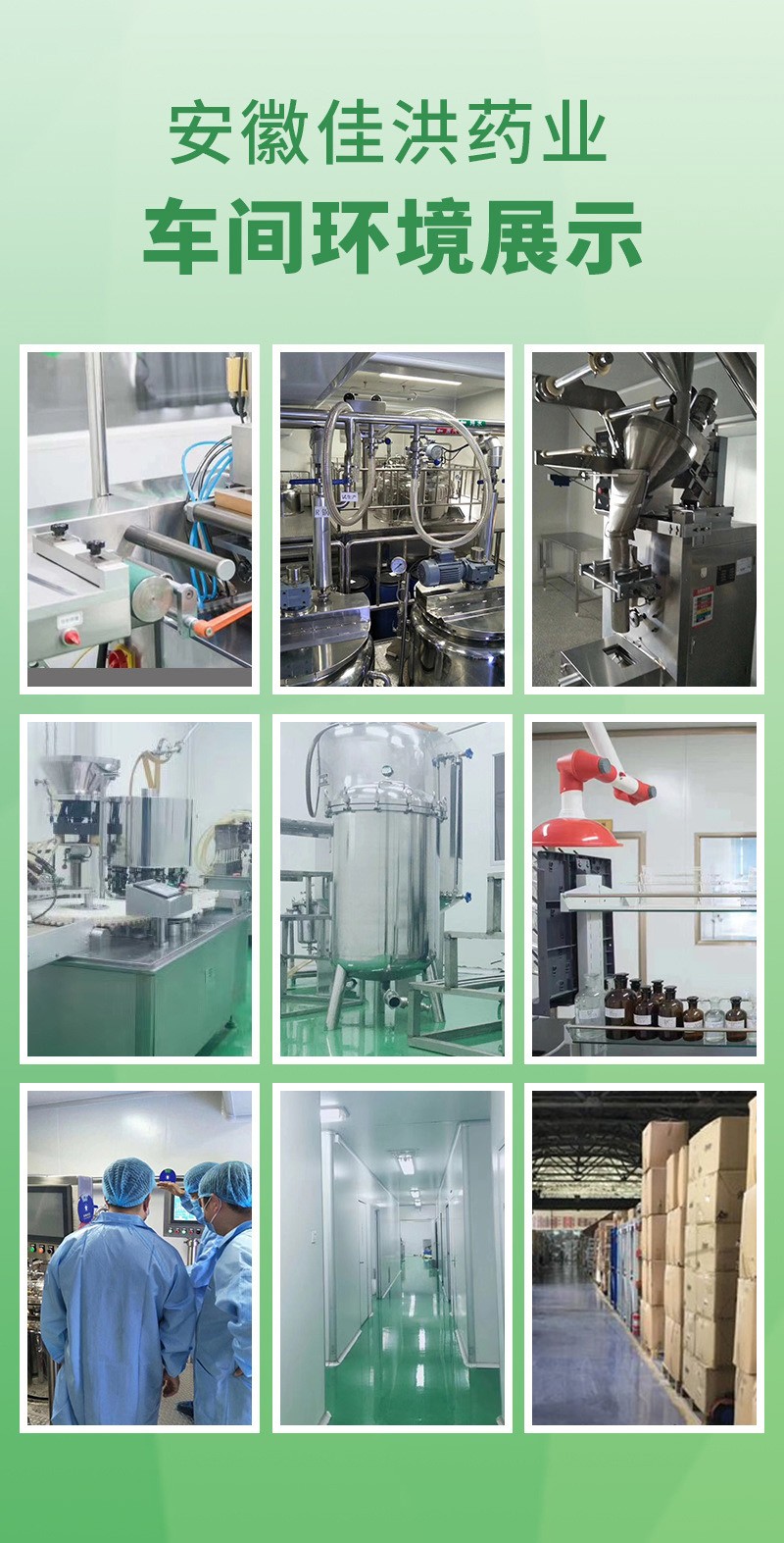 安徽佳洪健康產業有限公司位于全球最大的中藥材集散中心安徽亳州市,占地4600平方的現代化生產基地,其中生產車間占地2300平。倉儲面積2300平。國際先進的生產檢測設備,固體制劑、口服液、軟膠囊、保健用品、消毒用品、醫療器械、代用茶等生產車間,可生產加工片劑、硬膠囊劑、軟膠囊劑、顆粒劑、粉劑、凝膠等劑型,提供最完善的一站式OEM加工服務。獨立的工藝布局走向,能夠實現多品種、多劑型的同時聯動生產和單一品種的獨立生產。創造獨立的品牌及品牌OEM基地。