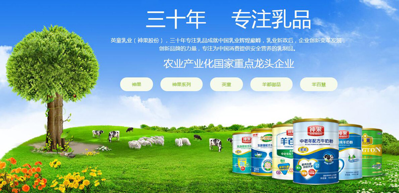 陜西神果股份有限公司始建于1987年,位于中國唯一的國家級農業高新區--楊凌農業高新技術產業示范區內,是我國西北地區生產規模最大、技術設備最先進的乳制品生產加工企業,1997年完成了股份制改造,是陜西省首家股份制農業產業化龍頭企業。是集乳制品、飲料加工生產、運輸、冷藏、養殖、廣告、金融、房地產開發于一體的大型股份制食品工業企業。是目前我國西北地區生產規模較大,技術設備最先進的乳制品生產加工企業之一。2014年根據國家乳業新政要求,神果完成乳品工廠的升級改造建設完全符合國家標準。同時,神果股份進行資產和股份重組,完成新一輪投資,神果股份在乳制品行業將會迎來更加強勁的發展機遇。神果股份成立27年來取得一系列的輝煌成就和榮譽,2014年9月神果股份再次被農業部、國家發展和改革委員會、財政部、商務部、中國人民銀行、國家稅務總局、中國證券監督管理委員會、中華全國供銷合作總社聯合審定為農業產業化國家重點龍頭企業。神果,羊都御品,英童,羊百慧品牌的乳酸菌及成人奶粉新配方新包裝隆重上市。