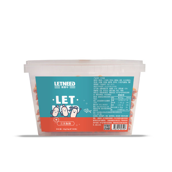 萊萊牛三文魚牛蝦鱈魚腸一千克盒裝多種口味火腿腸產(chǎn)品展示