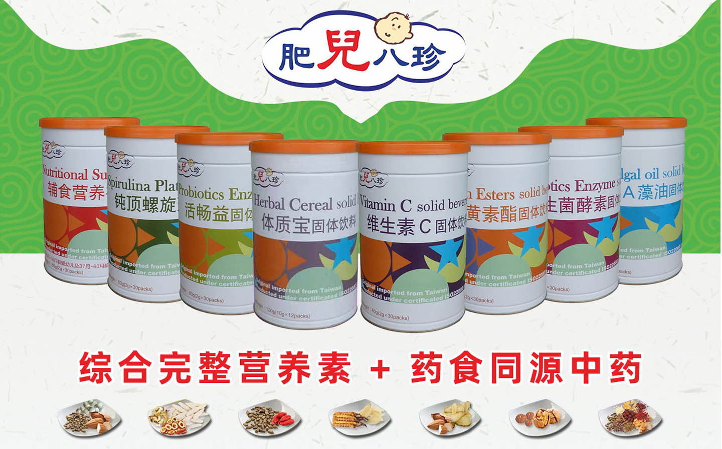 肥兒八珍藥食同源固體飲料系列有八款單品,分別是谷寶草本、輔食營養補充品、活暢益、維生素、DHA藻油、鈍頂螺旋藻、葉黃素酯、益生菌酵素。