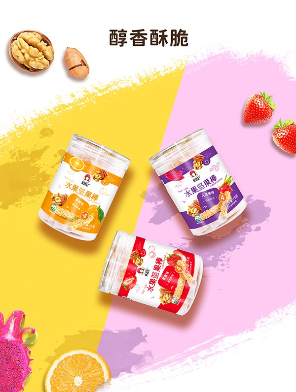 果蔬妃【水果堅果棒】充分結合水果與堅果的營養成分,融入花生、碧根果、芝麻、核桃的豐富口味,醇香酥脆,適合孕媽寶媽和3歲以上寶寶食用,有火龍果、草莓和香橙3種口味。